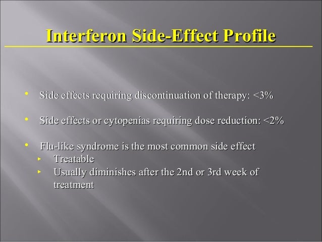 Depression secondary to interferon therapy it is by far the most frequent complication. Adverse effects of interferon and ribavirin combination therapy affect nearly all the patients with chronic hepatitis c who receive the therapy. Another undesired consequence of interferon therapy is the worsening of a preexistent psychiatric disorder.